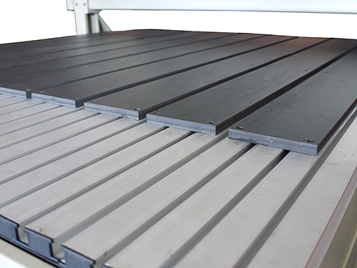 РАБОЧИЙ СТОЛ С «Т» - ПАЗАМИ Рабочий стол станка изготовлен из алюминия. Стол оснащен «Т» - пазами для механического крепления заготовок. Поверхность стола, в зоне обработки, покрыта специальным защитным слоем из износостойкого пластика. В случаях ошибок и прохождения инструмента ниже нулевой точки заготовки, защитный слой сохраняет инструмент и стол от повреждений. |