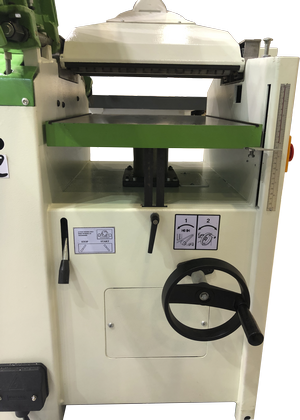 НАСТРОЙКА ПОЛОЖЕНИЯ ПОДАЮЩЕГО СТОЛА Осущевствляется винтовой передачей, это гарантирует постоянство выставленного размера, даже при перестройке станка с режима фугования на рейсмусование. |